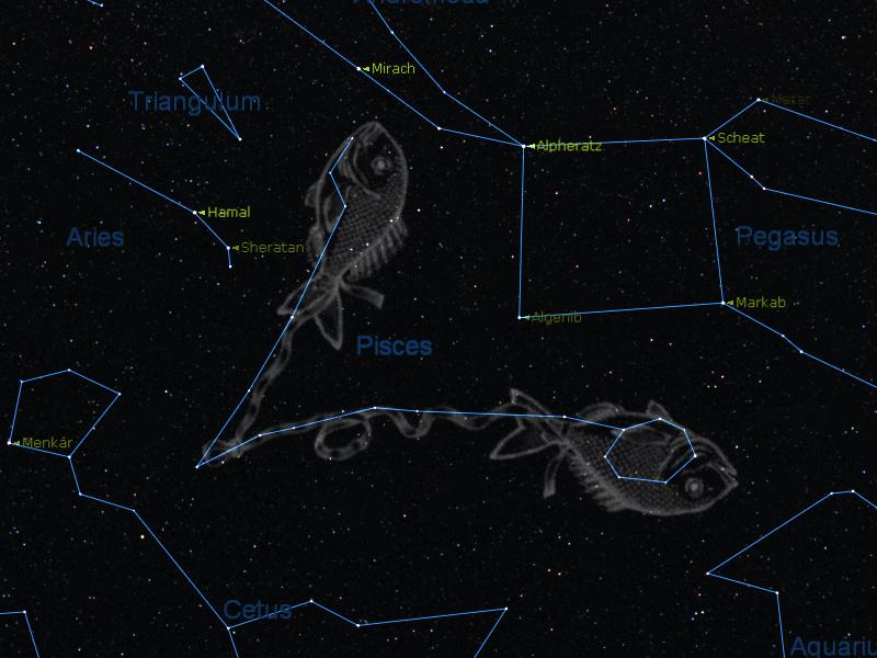 C'est une constellation du Zodiaque, déjà décrite par les chaldéens et les babyloniens. L'étoile a est Alrescha ("la corde" en arabe). Ce nom nous rappelle que la constellation représente deux poissons reliés par une longue corde avec un noeud au milieu. Le poisson le plus au Sud est dessiné par un groupe d'étoiles formant presque un cercle (L'Anneau).